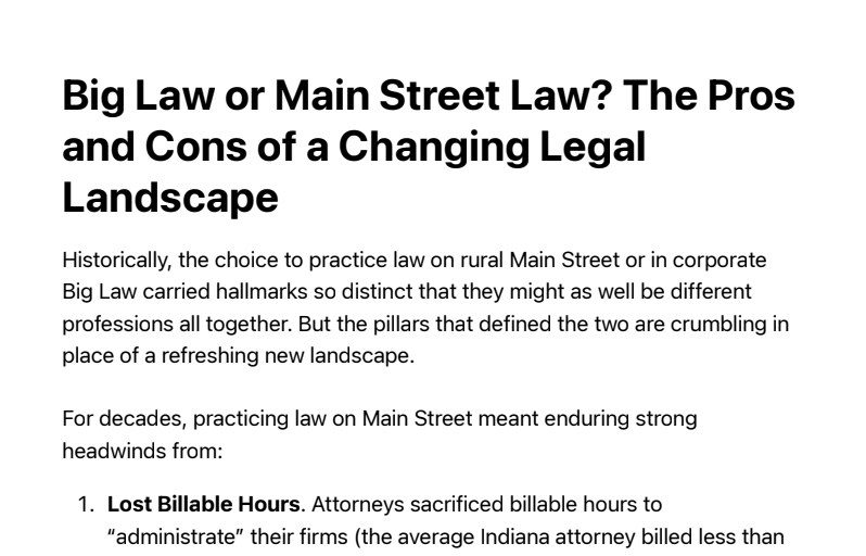 Historically, the choice to practice law on rural Main Street or in corporate Big Law carried hallmarks so distinct that they might as well be different professions all together. But the pillars that defined the two are crumbling in place of a refreshing new landscape.